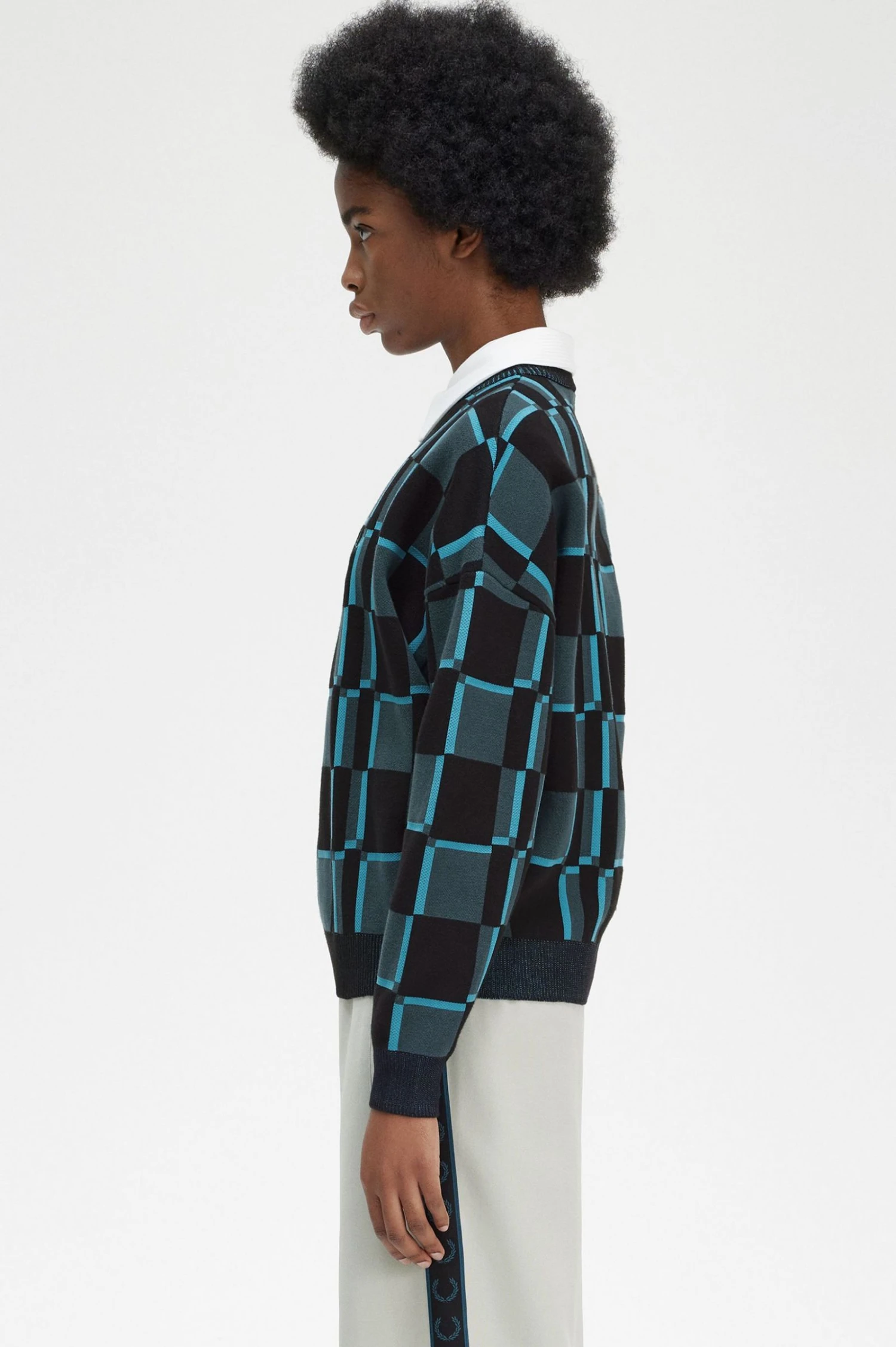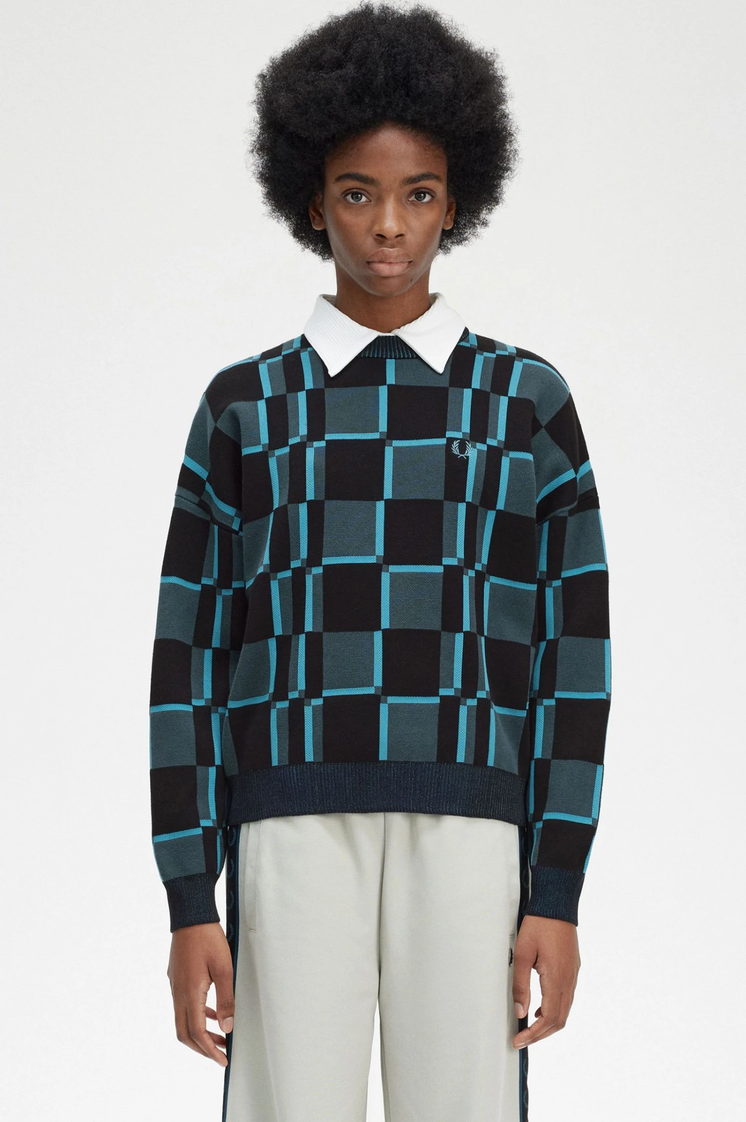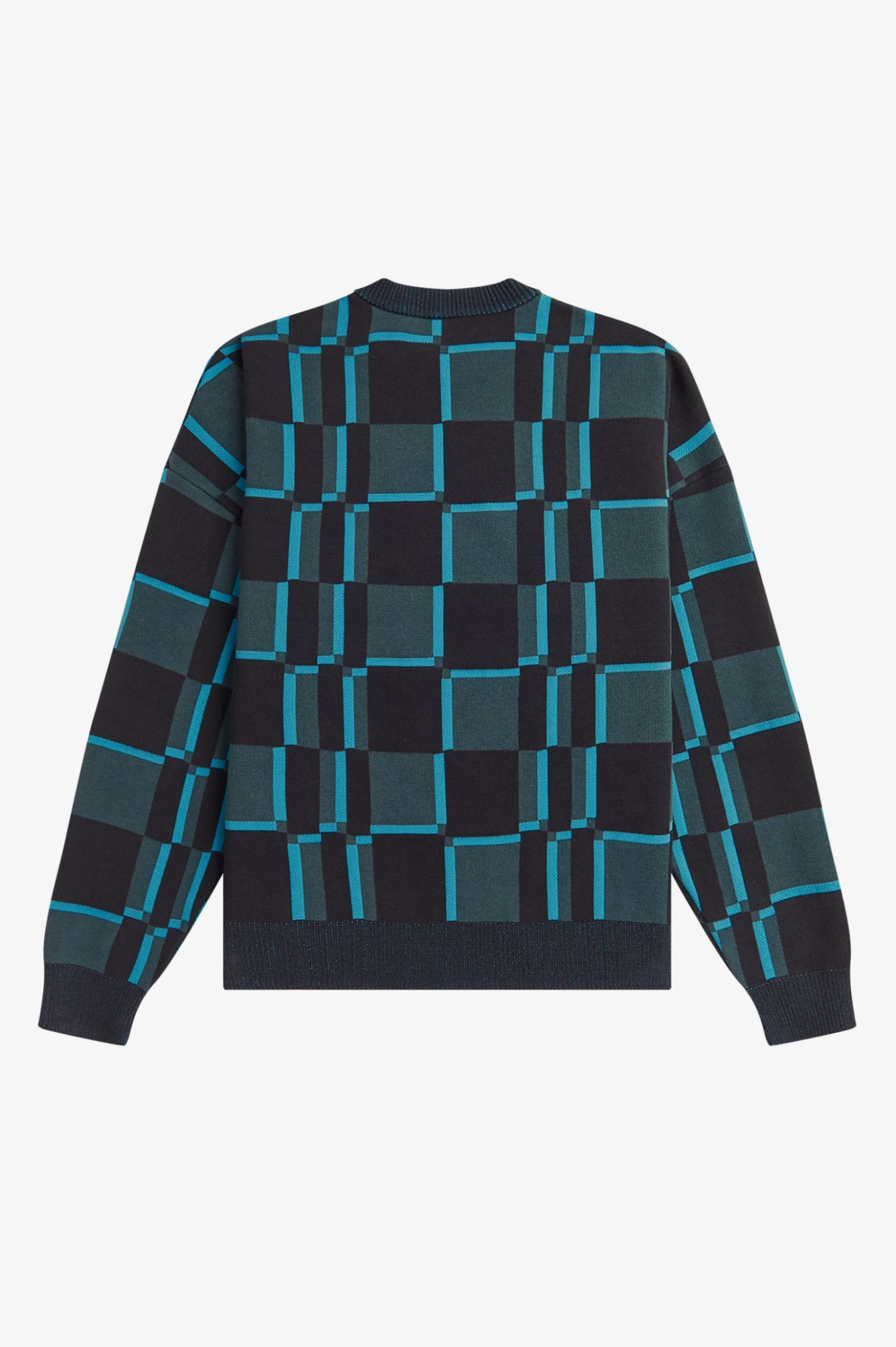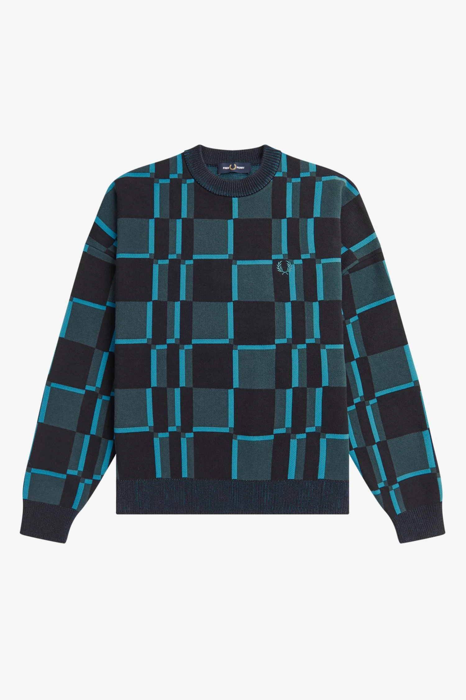 When warm evenings turn into cool nights, bold knits offer an extra layer for when you’re just not ready to go home yet. Our cotton crew neck jumper features a Fred Perry take on classic chequerboard, with a 5-4-4 grid ratio borrowed from our signature twin tipping.