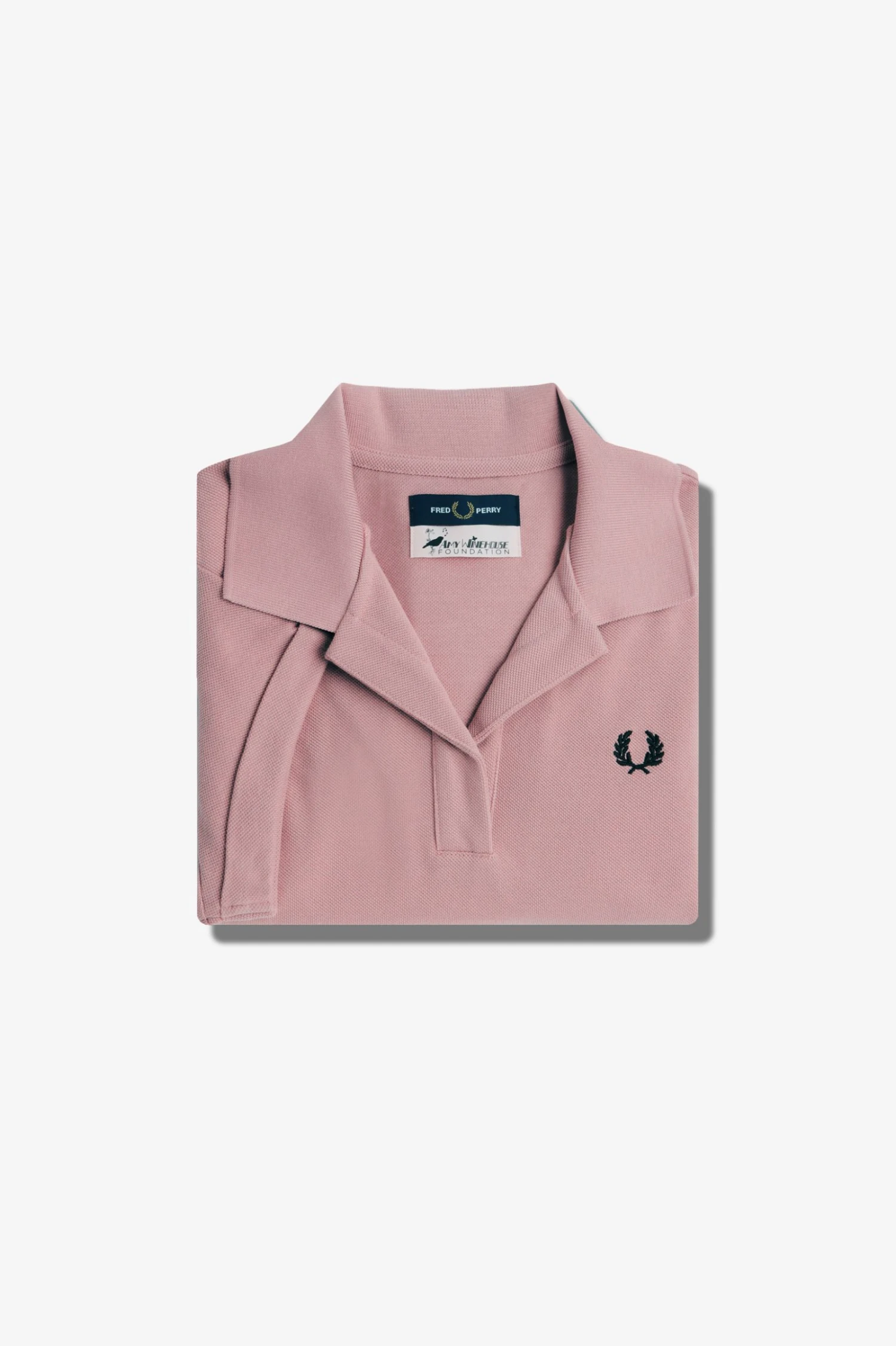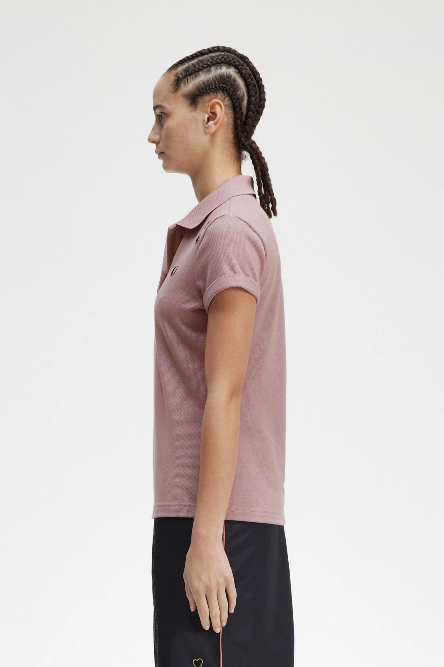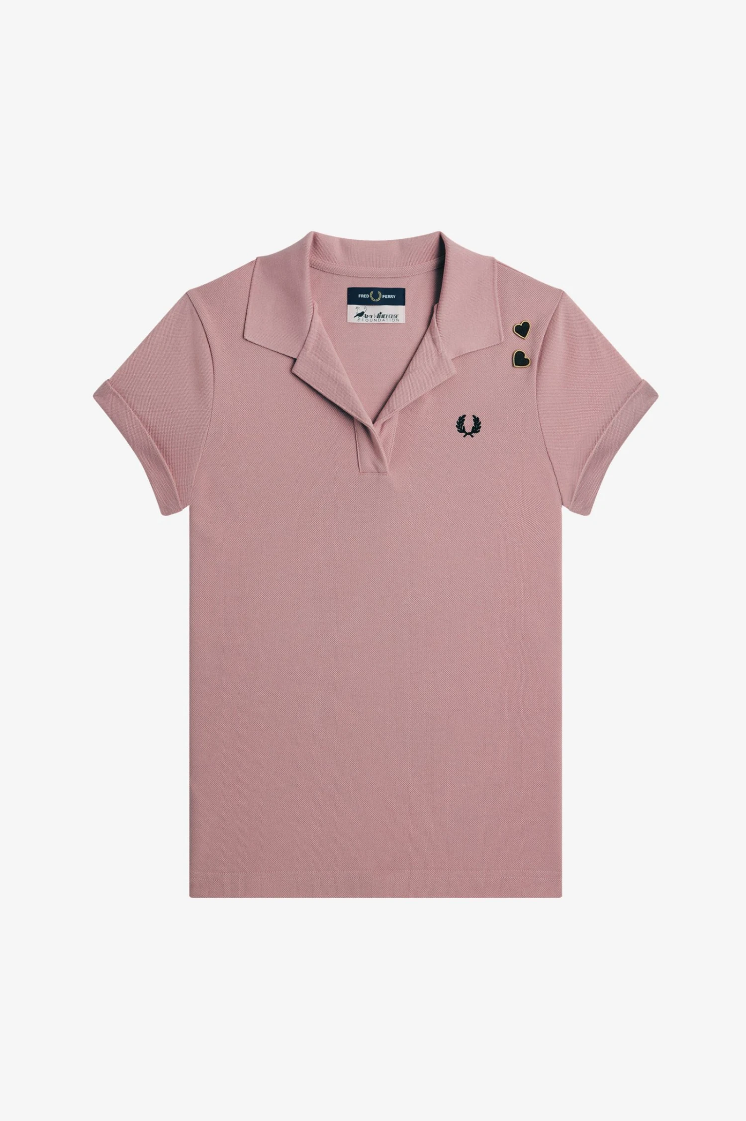 Our Amy open collar cotton piqué shirt is inspired by her original Fred Perry designs, and our original polo shirt. Featuring black and gold embroidered heart patches – a reference to Amy’s tattoos – and a smart open collar for pairing with your V-neck. Dress it up or dress it down.