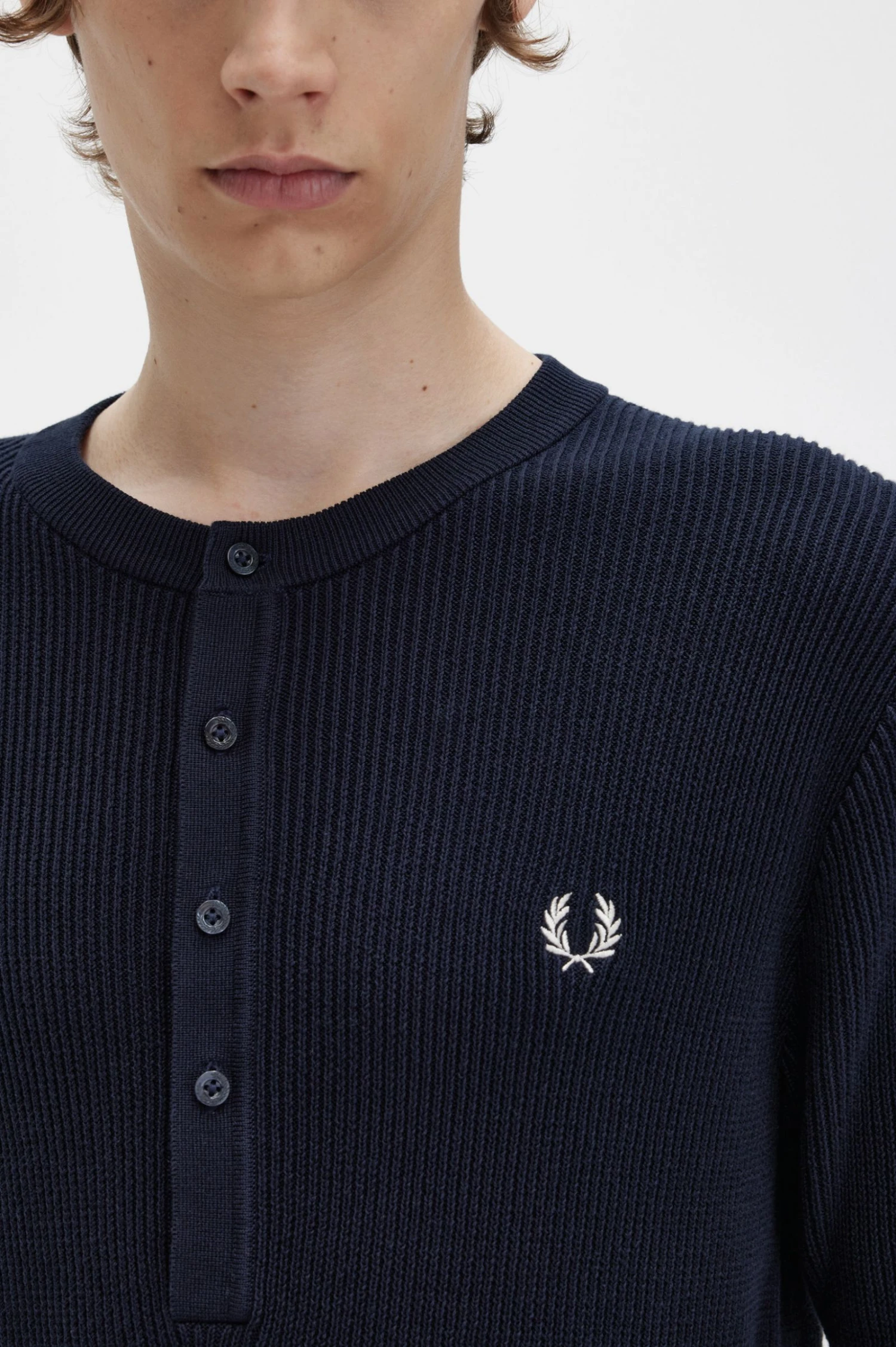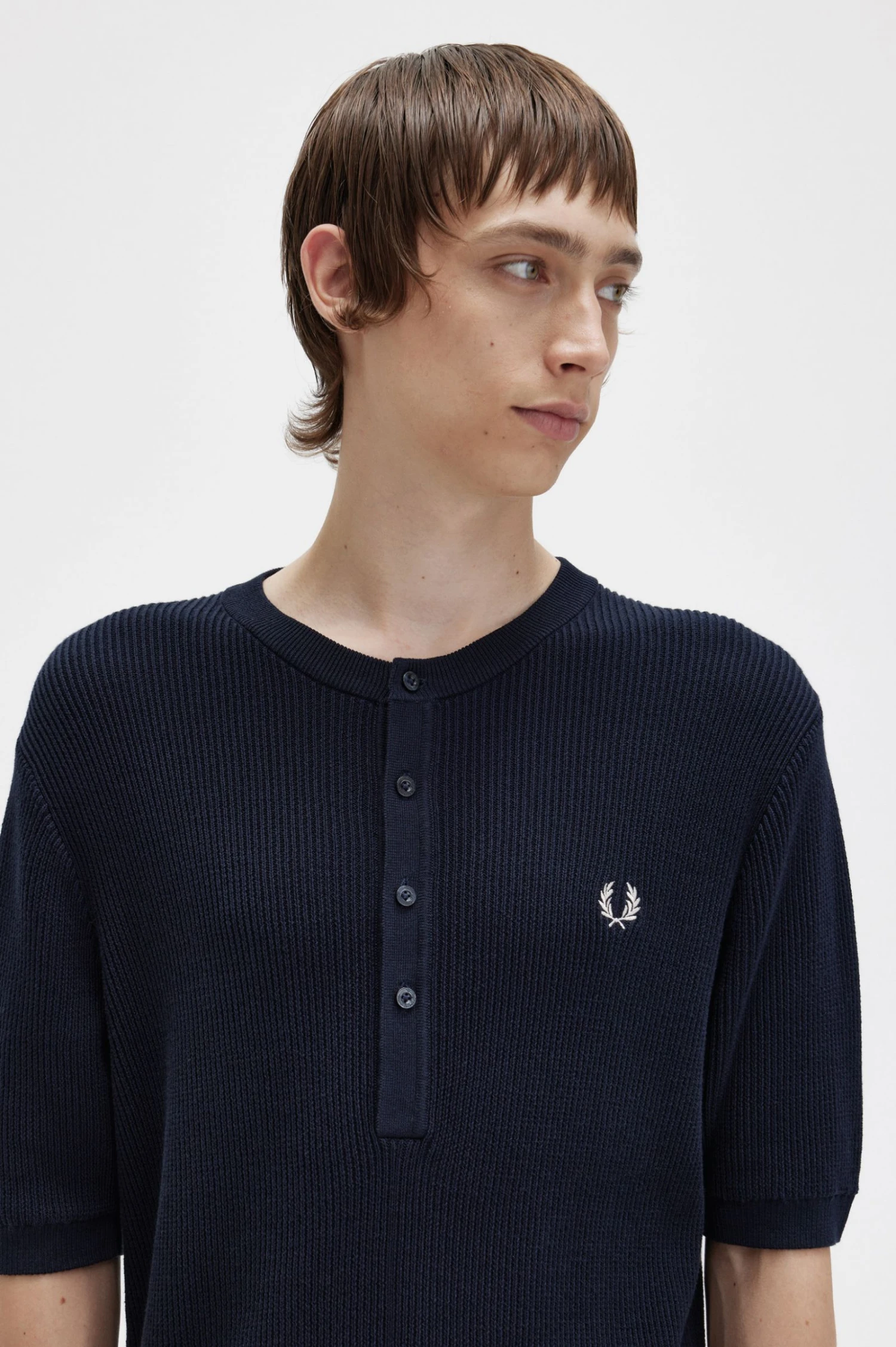 Inspired by the sharp, clean lines of modernist, our knitted shirt is gassed for a smooth and sharp finish. Designed with a Henley-style neckline and lengthened placket, inspired by the sport to sharp cross-over at the heart of Fred’s original designs.