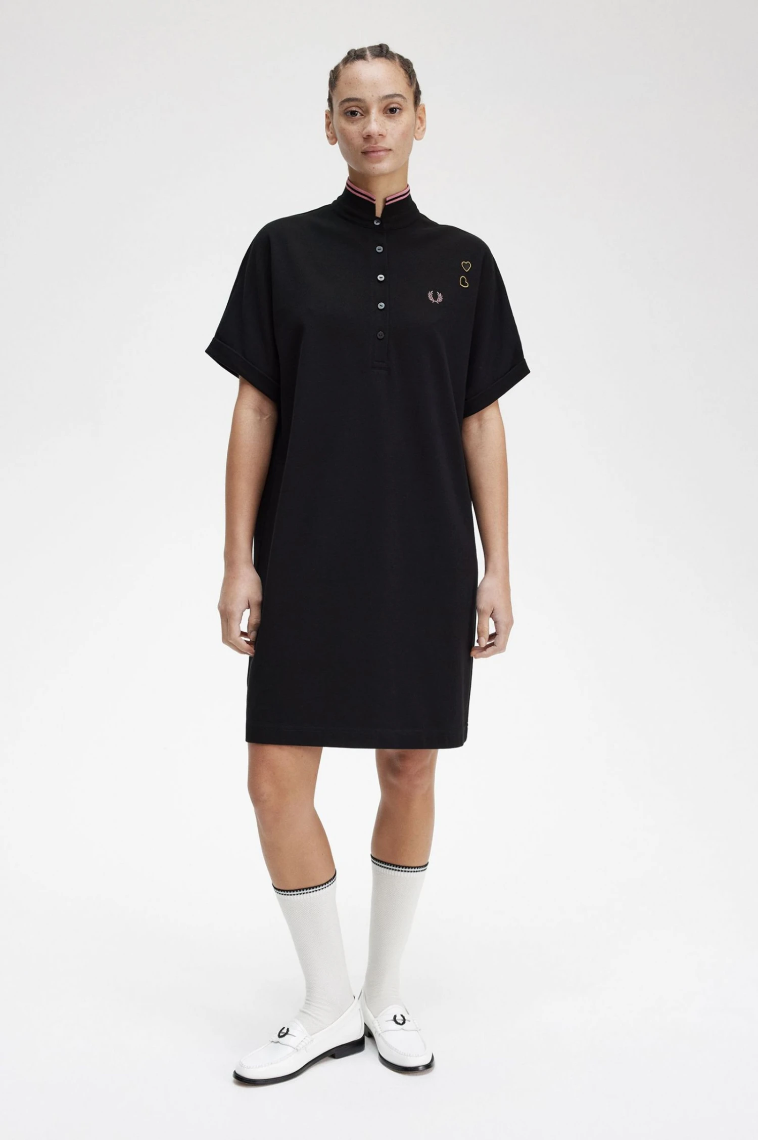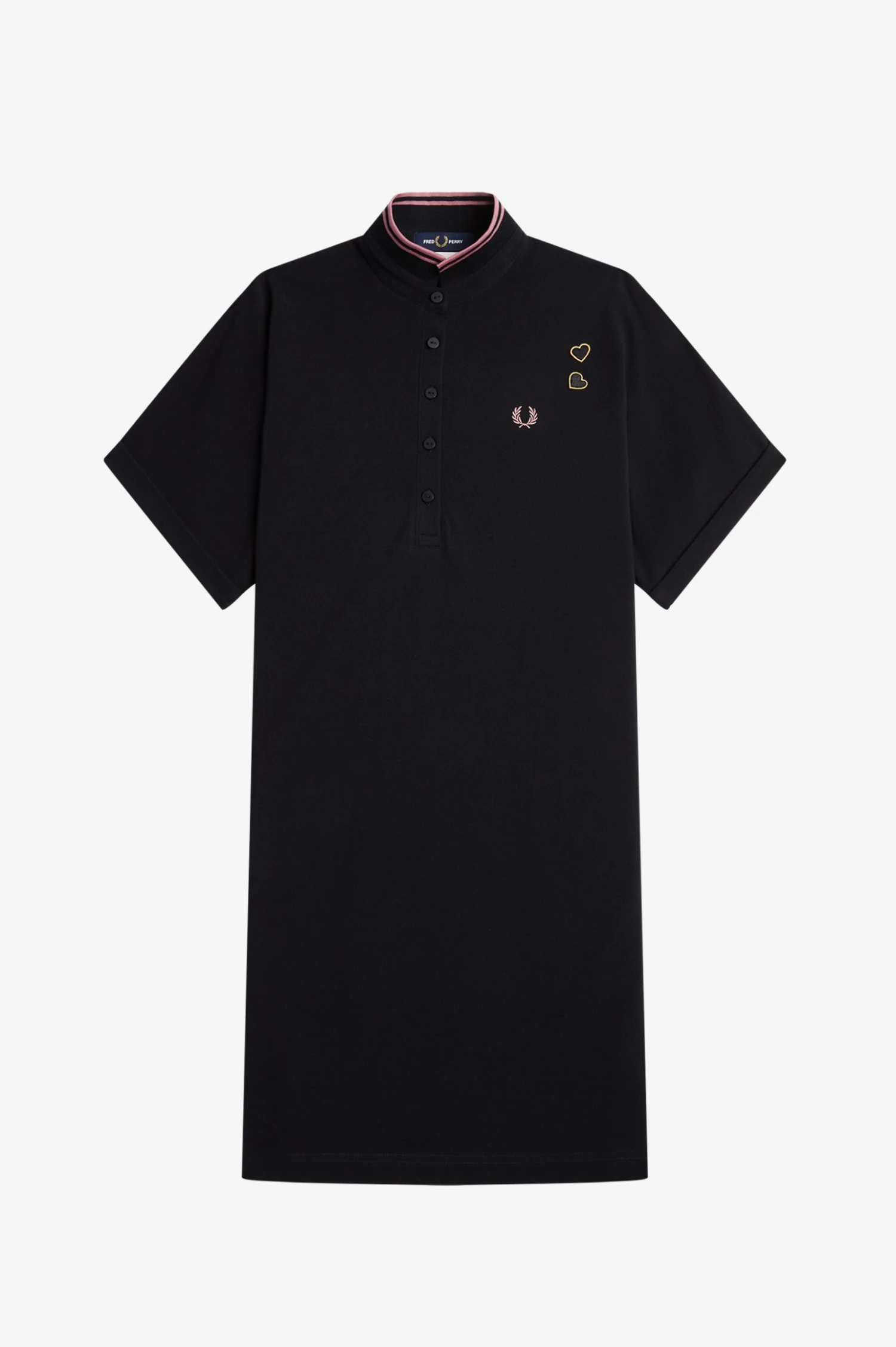 An ideal after-dark piece lets you move, breathe, and dance while still looking sharp. Our Amy tipped piqué dress is inspired by the British night out and Amy’s original Fred Perry designs. Featuring black and gold embroidered heart patches – a reference to Amy’s tattoos – and our signature twin tipping to the stand collar.
