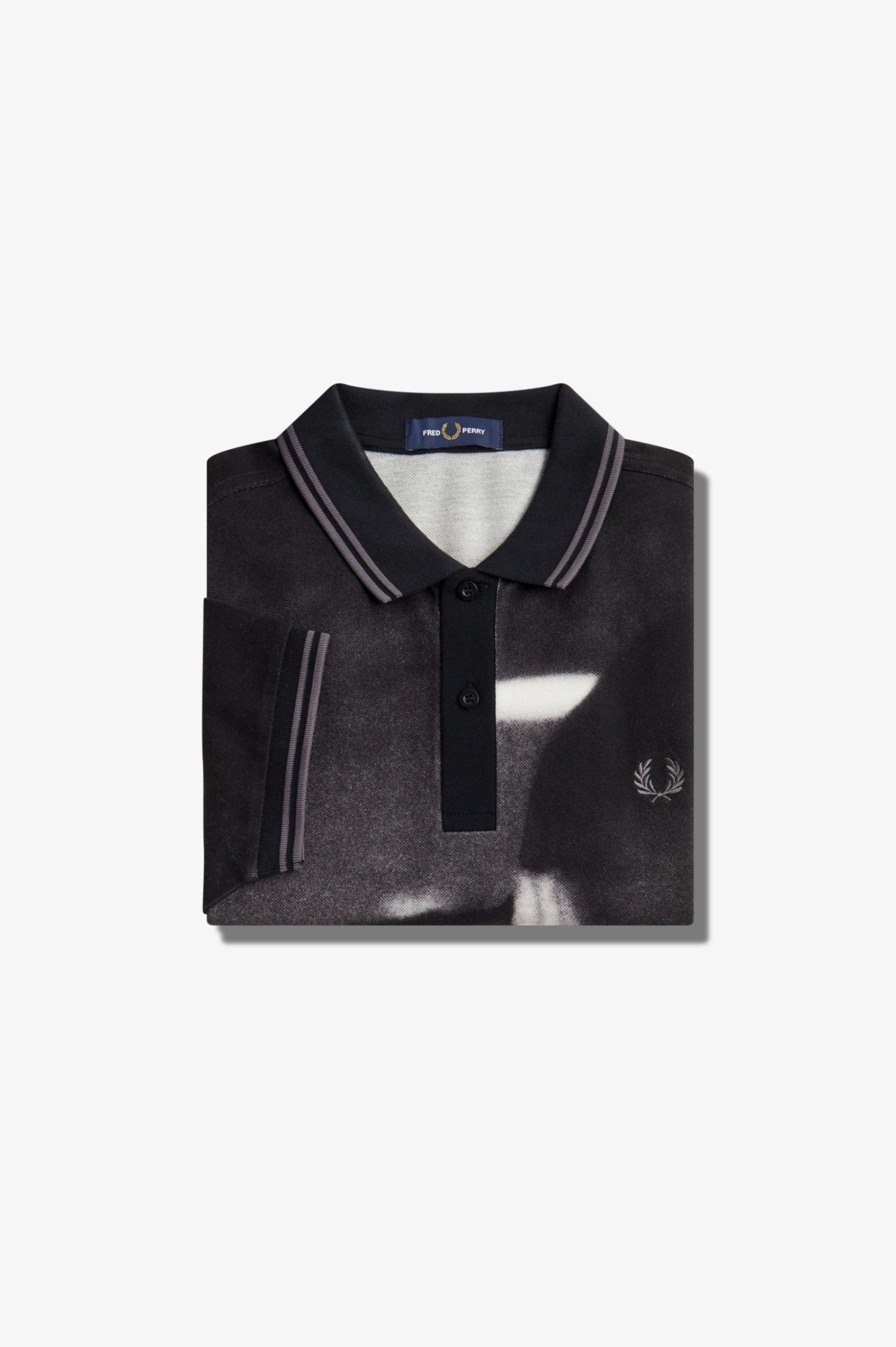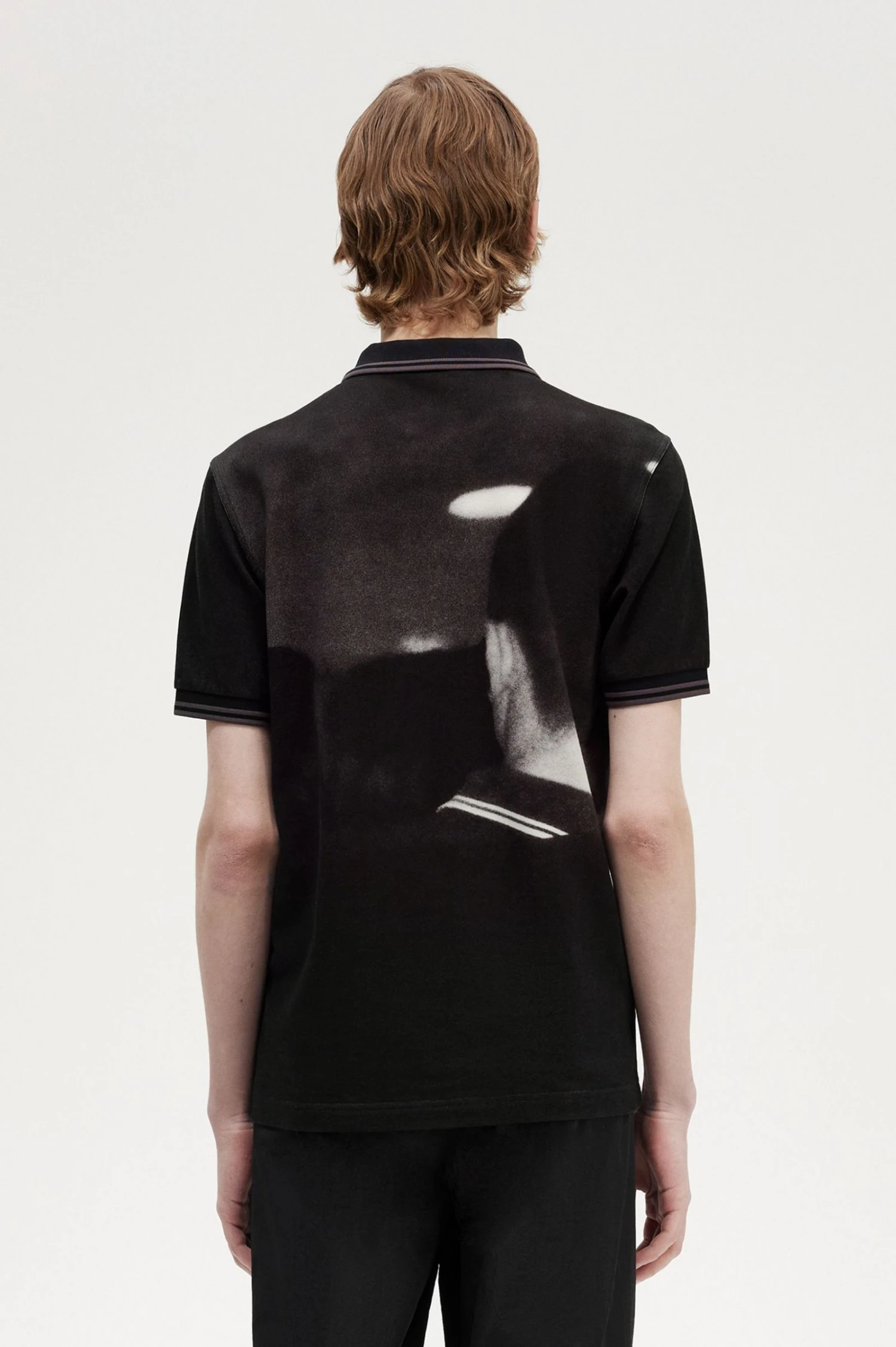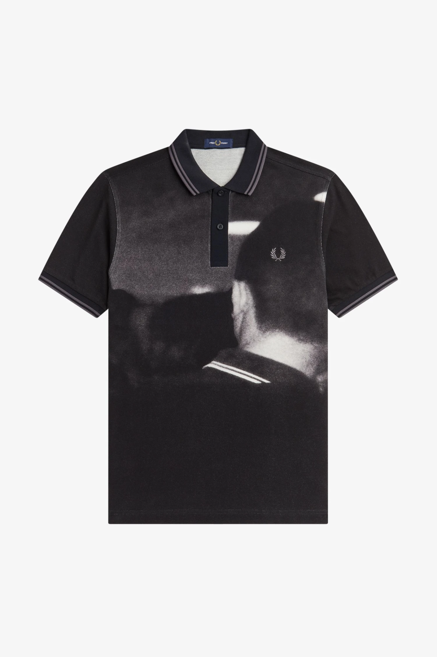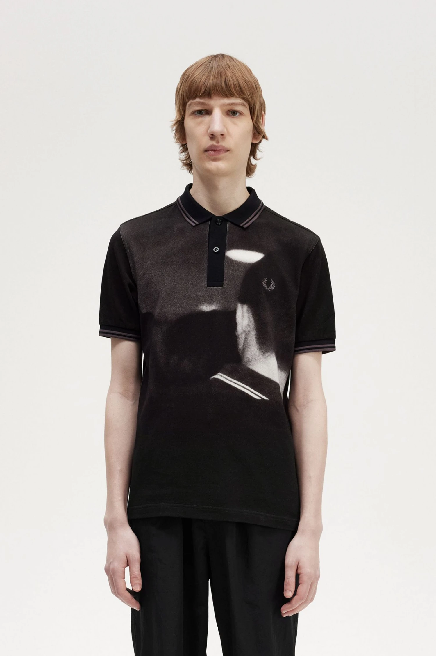 Our rave graphic polo shirt is inspired by the nostalgia of the glitchy, lo-fi tech of the late nineties and early noughties. Handheld cameras, mixtapes, pixelated computers, photocopied nightclub flyers, and pirate radio stations. Hazy memories, city nights, and first holidays. Our rave graphic Fred Perry shirt is a raving staple.Â
